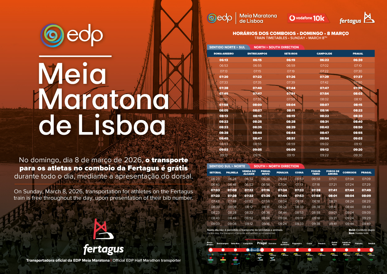 As in previous editions, Fertagus will support the EDP Lisbon Half Marathon as the Official Transport Partner, offering free round‑trip travel to all participating athletes who present the official race bib.